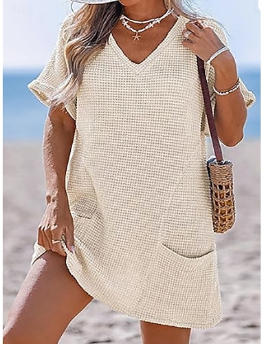 Dame Badetøy Dekke Opp Badedrakt Kjoler Badedrakt Lapper Lomme Ferie Strand Klær عادي V-hals Kort Erme Badedrakter