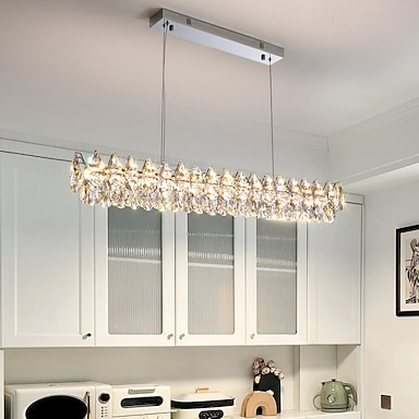 Klar kjøkkenøy-taklampe med klar krystall, bergkrystallmateriale, geometrisk armatur, vanlig skjermform, lys i tre farger og justerbar opphengslengde