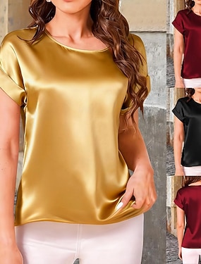 Dame Satengtopp Satengbluse Sommertopper Glimmer Helfarge Stilfull Grunnleggende Ermeløs Crew-hals Vanlige topper Daglig utendørs Arbeid Vinrød Svart Gull Sommer Vår