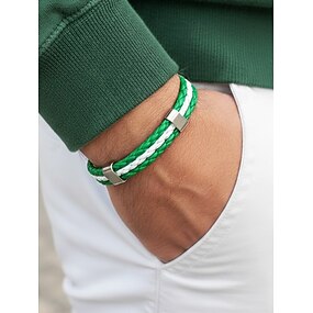 Flettet armbånd i kunstskinn til herre, grønt og hvitt vevd armbånd med metallspenne, avslappet irsk stil for menn, perfekt for høytidsparade, fest og juleklær