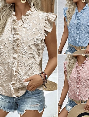Dame Teksturbluse Øyetopp Pointelle-t-skjorte Bluse Uthult عادي Årgang Stilfull Kortermet V-hals Vanlige topper Avslappet Daglig Strand Svart Hvit Rosa Grønn Lyseblå Sommer Vår