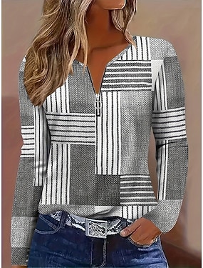 Dame T skjorte Glidelås Trykt mønster Grafisk Geometrisk Ruter Årgang Stilfull Klassisk Langermet Crew-hals V-hals Vanlige topper Daglig Helg Svart og Hvit Høst Vinter