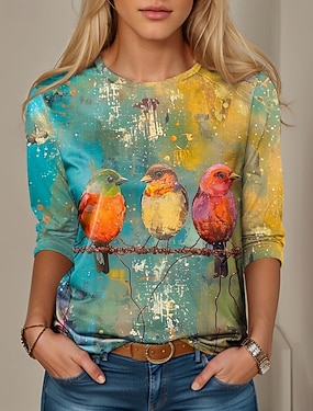 Kvinne T-skjorte lang erm rund hals langermet tunika grafisk dyre fugl vintage stilig klassisk vanlige topper daglig helge trykk blå grønn forhøst