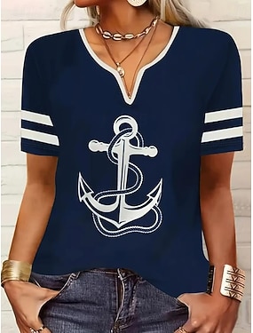 Dame T skjorte Trykt mønster hav Stripet Anker Fritid Kortermet Hals med hakk Vanlige topper Daglig Ut på byen Strand Klær Navyblå Sommer Vår