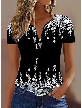 Dame T skjorte Quarter Zip Blomstret Grafisk Planter Tropisk Hawaiisk Stilfull Kortermet Crew-hals Vanlige topper Daglig Sport Ut på byen Svart Rose Rosa Sommer Vår