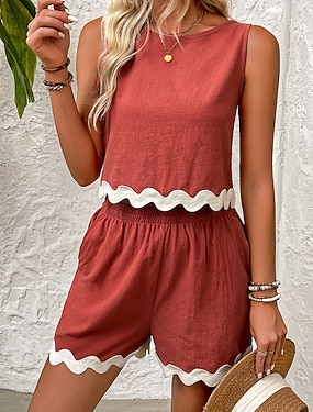 Dame Shortssett Kortermet Crew-hals Helfarge Mote Gatemote Avslappet Daglig utendørs Rosa Vin Navyblå Sommer Normal