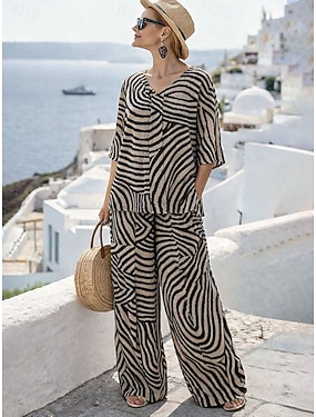 Dame Todelt sett Vest Buksesett Ermeløs V-hals Stripet Mote Gatemote Avslappet Daglig utendørs Svart Lysebrun Brun Sommer Normal