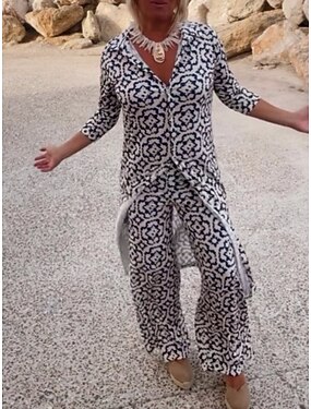 Kvinners Skjorte Grunnleggende Bukser Sett Halv Erme Rund Hals Blomstermønster Grafisk Geometrisk Print Ferie Helg Svart Kongeblå Blå Sommer Vanlig Passform