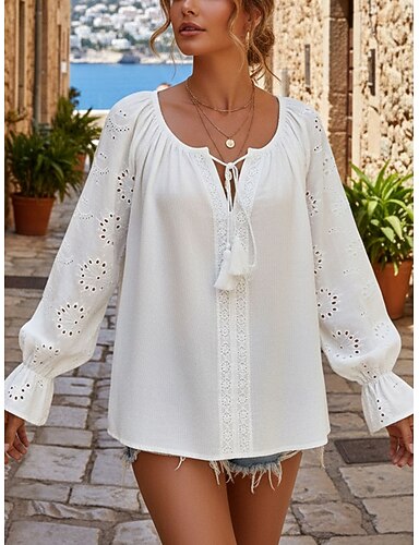 Dame Skjorte Bluse Blonde عادي Fritid Langermet Crew-hals Vanlige topper Daglig Ut på byen Hvit Sommer