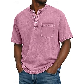 Herre Henly-skjorte 100% bomullssyre-vaskeskjorte T-skjorte T-skjorte Kortermet Ensfarget Retro / vintage Fritid Lomme Gammeldags stil Vasket Henley Avslappet Sommer Vår Høst Svart Rosa Lysegrønn