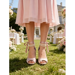 rosa brudepike-sandaler med blokkhæl – sateng med åpen tå og åpen tå til bryllup, perlemorfargede ankelstropper med sløyfe, tykke høyhælte pensko til brudefølget, seremoni, mottakelse, skoleball og formelle arrangementer