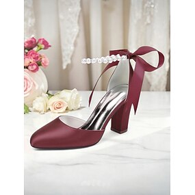 Damesko med burgunderfargede satenghæler – spisse pensko med krystallrem til cocktailfester og elegante kveldsarrangementer