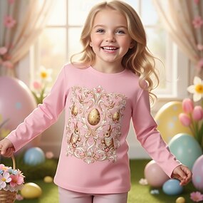 Påske jente-T-skjorte med 3D-grafikk og kanin, langermet, 3D-trykk, vår, høst, sport, mote, gateklær, barn 4-12 år, rund hals, avslappet, daglig, utendørs, normal passform