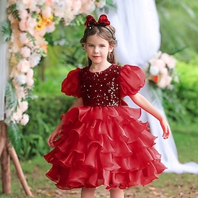 Blomsterpikekjole Jente Formell kjole Bryllupsantrekk Fest Bryllup Formell Formelt Prinsesse Vakker Paljetter Lapper Helfarge Kortermet Crew-hals Svart Rød 4 år +