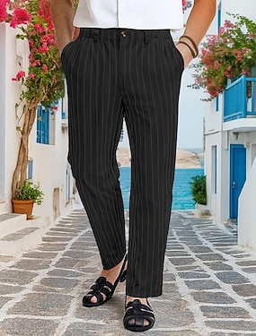 Herre Dressbukser Linbukser Bukser Sommerbukser Posete bukser Lomme Rett ben Stripet Komfort Pustende Full lengde Feriereise Daglig Ferie Ferie Hawaiisk Svart Hvit Uelastisk