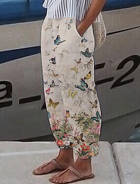 Dame Imitert bomullslin Sommerbukser Bukser Posete bukser Mote Full lengde Blomstret Sidelommer Posete Trykt mønster Komfort Uelastisk Fritid / hverdag Blå Kakifarget Normal