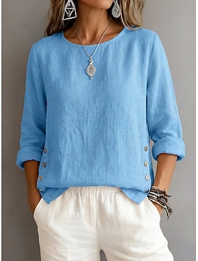 Dame T skjorte T-skjorte i bomullslin T-skjorte Knapper عادي Mote Stilfull Klassisk Kortermet Crew-hals Vanlige topper Daglig Ut på byen Helg Blå Hvit Gul Militærgrønn Navyblå Sommer Vår