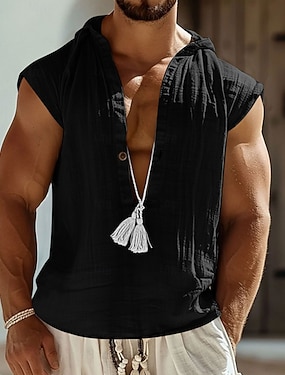 Herre Skjorte Linskjorte Viking stil Popover skjorte Sommerskjorte Strand Klær Helfarge Feriereise Hjem Svart Navyblå Himmelblå Grønn Ermeløs Hettegenser Sommer Vår Klær