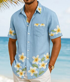 Herre linskjorte Strand Klær Hawaii skjorte Skjorte med knapper Aloha skjorte Hawaii Feriereise Avslappet Blå Kortermet Aftæpning Sommer Vår Klær Blomster