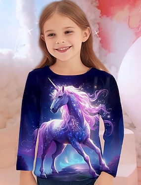 Jente 3D enhjørning T-skjorte Skjorter Langermet 3D-utskrift Høst Vinter Aktiv Mote søt stil Barn 3-12 år Crew-hals utendørs Avslappet Daglig Normal