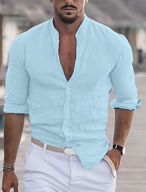 Herre Linskjorte Popover skjorte Uformell skjorte Strandskjorte Skjorte med bandkrage عادي Strand Feriereise Blå Svart Hvit Rosa Langermet Henley Vår sommer Klær