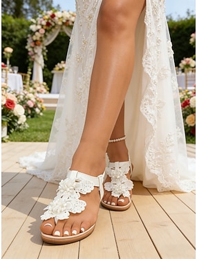 Hvite blondesandaler med blomstermønster til dame, elegante komfortsko for bruder i utendørs hagebryllup