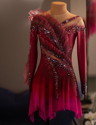 Kjole til kunstløp Dame Jente Skøyteløp Kjoler Rød Lapper Tommelhull Netting Spandex Elastisk Trening Profesjonell Konkurranse Skøyteklær Hold Varm Krystall / Rhinstein Langermet Skøyting Kunstløp