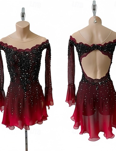 Kjole til kunstløp Dame Jente Skøyteløp Kjoler Burgunder Lapper Tommelhull Netting Spandex Høy Elastisitet Trening Konkurranse Skøyteklær Klassisk Krystall / Rhinstein Langermet Skøyting Kunstløp