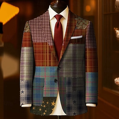 Herre Ruter Blazer jakke Frakk Mote Bekvem Pustende Kunstnerisk Fritid Daglig Festkveldsklær Lomme 3D-utskrift Knapper Alle årstider Med hakk Langermet Blå Lilla Grønn