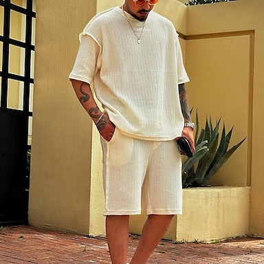Herre T-skjorte drakter 2 stk antrekk T-skjorte og shorts Kortermet Crew-hals Sommer عادي Mote Fritid 2 deler Feriereise Dagligdagstøy Ut på byen Beige Topp T-skjorte for menn