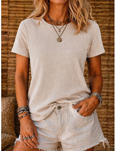 dame-T-skjorte i 100 % bomull vintage-vasket topper mote stilig klassisk korte ermer rund hals lange topper avslappet daglig strand roserød blå gressgrønn svart oransje sommer vår