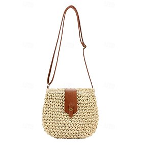 Dameveske i vevd strå med lærreim – elegant veske i bohemsk stil for sommer, strand og uformelle utflukter