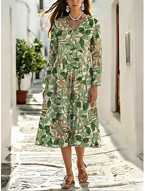 Dame Maxikjole Imitert bomullslin Skiftkjole Fritid Daglig Normal Blomstret 3/4 ermer V-hals Gul Grønn Grå Vår Høst