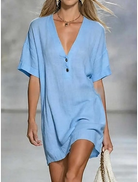 Kvinners 100% bomull midi-kjole faux lin sun kjole A-linje kjole sommer kjole ferie fest avslappet daglig kontor strand løs passform ensfarget halv ermer V-hals lyseblå svart olivengrønn gul