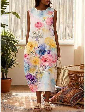 Dame Midikjole Imitert bomullslin Boho-kjole Skiftkjole Solkjole Årgang Daglig utendørs Feriereise Normal Blomstret Ermeløs Crew-hals Blå Svart Rosa Oransje Sommer Vår