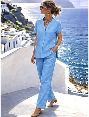 Dame Linsett i bomull Buksesett Langermet V-hals Helfarge Mote Gatemote Avslappet Daglig utendørs Blå Hvit Brun Sommer Løstsittende