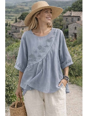Dame Skjorte Skjorter i bomullslin Bluse Imitert bomullslin Broderi Helfarge Grunnleggende Fritid 3/4 ermer Crew-hals Vanlige topper Daglig Blå Hvit Rosa Kakifarget Sommer Vår