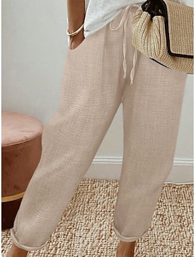 Dame Imitert bomullslin Sommerbukser Posete bukser Avskårede bukser Ferie Gatemote Grunnleggende Full lengde Middels midje Helfarge Snorer Lomme Uelastisk Daglig utendørs Gate Blå Grå Mørk Marinebl