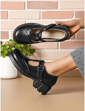 Svarte damesko i kunstskinn med t-rem – vintage-inspirerte pendlersko med utskjæringsdetaljer for jobb og dagtid