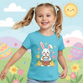 Påske jente-T-skjorte med 3D-grafikk og kanin, korte ermer, 3D-trykk, sommer, vår, sport, mote, gateklær, barn 4-12 år, rund hals, avslappet, daglig, utendørs, normal passform