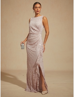 Dame Maxikjole Tubekjole Elegant Aftenselskap Bryllupsgjest Paljetter Blonde Drapering Normal Helfarge Ermeløs Båthals Blush Pink
