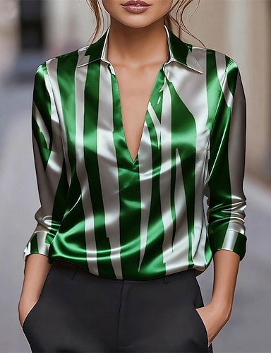 Dame Skjorte Elegant Satengtopp Sommertopper Rynket Lapper Trykt mønster Grafisk عادي Elegant Årgang damer Langermet V-hals Vanlige topper Daglig Arbeid Ferie Grønn Sommer Vår