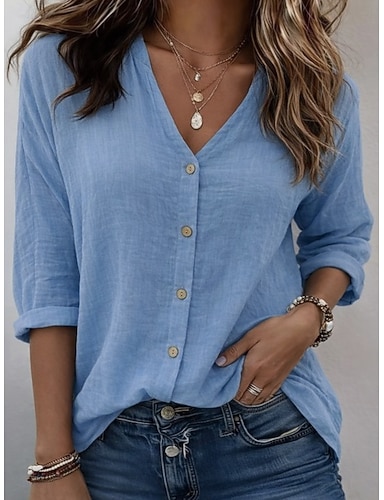 Dame Bluse Bomullsskjorte Blonde Lapper Helfarge Daglig Stilfull Grunnleggende 3/4 ermer V-hals Vanlige topper Daglig Blå Hvit Grønn Kakifarget Sommer Vår Høst
