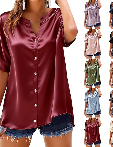 Dame Sateng skjorte Dresskjorter Bluse Helfarge Elegant Mote Fritid Kortermet Aftæpning Vanlige topper Daglig Kontor Arbeid Blå Svart Hvit Gul Grå Sommer Vår