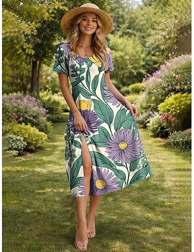 Dame Midikjole Solkjole Kjole med A-linje Ferie Fritid Strandstil Daglig Ut på byen Normal Blomstret Grafisk Kortermet Crewneck Blå Gul Rosa Lilla Sommer