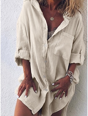 Dame Skjorter i bomullslin Lomme Knapper Helfarge Årgang Stilfull Grunnleggende Langermet Skjortekrage Vanlige topper Daglig Hvit Rosa Himmelblå Aprikos Sommer Vår Høst