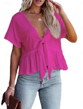 Dame Skjorte Bluse Bomullsskjorte Imitert bomullslin knyte foran Drapering عادي Stilfull Klassisk Moderne Kortermet V-hals Vanlige topper Daglig Ferie Ut på byen Svart Hvit Rose Rosa Grå Sommer Vår