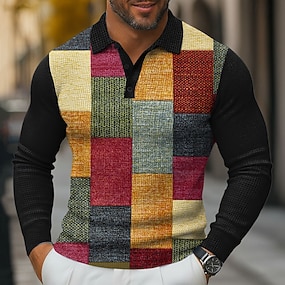Herre Fargeblokk Geometrisk Vaffel poloskjorter Langermet Poloskjorter Skjorter med krage Business Casual Virksomhet Arbeidsklær Dagligdagstøy 3D-utskrift Knapper Vår Høst Vinter Rød 1 Rød 4 Rød 3