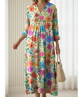 Kvinners midi kjole V-hals lange ermer kaftan lett løs passform A-linje kjole uformell boho fest utgående blomster grafisk abstrakt lange ermer V-hals grå hvit gul rosa