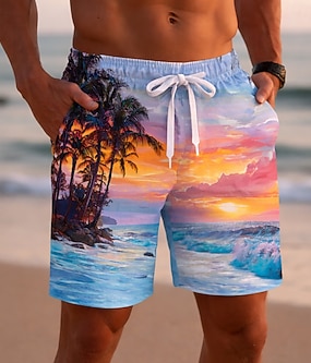 Herre 3D Print hav Solnedgang Badeshorts Surfeshorts Medium Midje Gatemote Hawaiisk Feriereise Sidelommer Mesh fôr Elastisk snøring i midjen Designer Klær